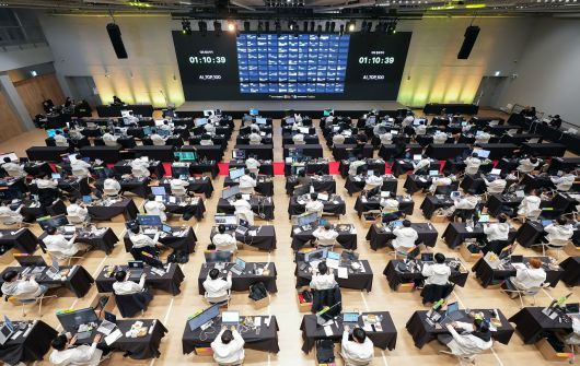 카카오임팩트와 브라이언임팩트가 지난달 22일 경기 용인시 카카오 AI캠퍼스에서 공동으로 개최한 경진대회 ‘AI 톱 100’에서 참가자들이 문제를 푸는 모습. [카카오 제공] |
