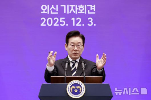 [서울=뉴시스] 최동준 기자 = 이재명 대통령이 3일 청와대 영빈관에서 열린 '새롭게 선 민주주의, 그 1년' 외신 기자회견에서 모두발언을 하고 있다. 2025.12.03. photocdj@newsis.com |