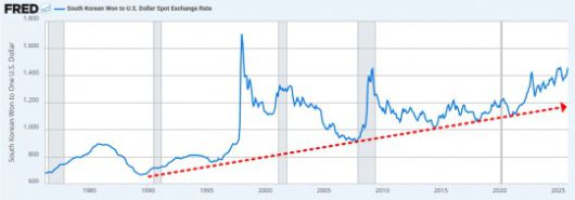 원달러 환율이 1400원 선을 넘어 거래된 시기는 외환위기(90년대 후반), 미국발 금융위기(2008년), 코로나19 팬데믹(2022년), 계엄사태(2024년) 등 손에 꼽는다. 해당 이슈들은 국내 경제에 위협적인 요인이었던 만큼 ‘원달러 환율 1400원’은 상징적으로도 간과하기 어렵다.