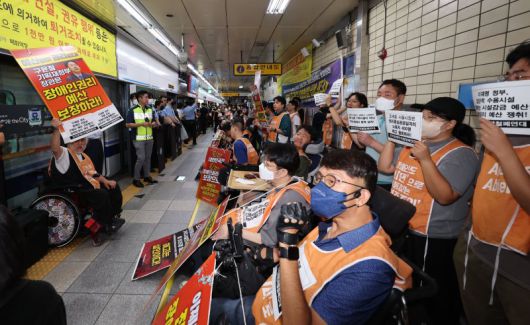 전국장애인차별철폐연대 용산역 지하철 시위 벌여