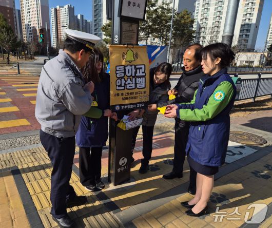 (충주=뉴스1) 윤원진 기자 = 충북 충주경찰서가 어린이 교통사고 예방을 위해 횡단보도 내 안심벨을 시범 운영해 눈길을 끌고 있다.
