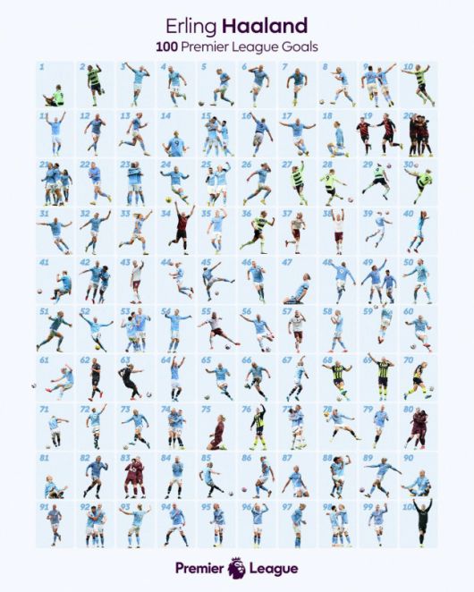 홀란은 지난 2022년 보루시아 도르트문트에서 맨체스터 시티로 이적한 뒤 3년 4개월, 불과 111경기 만에 100골을 돌파했다. 이는 EPL 출범 이후 최다득점자 앨런 시어러가 세운 124경기 기록을 13경기나 앞당긴 역대 최단 기록이다. 그 뒤로 해리 케인(141경기), 세르히오 아구에로(147경기), 티에리 앙리(160경기) 등 걸출한 공격수들까지 모두 제친 속도다.