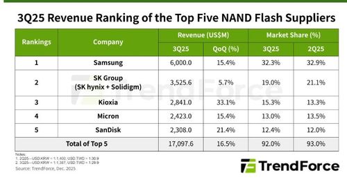 3일 시장조사업체 트렌드포스에 따르면 3분기 전 세계 낸드 상위 5개 브랜드의 합산 매출은 지난 2분기 대비 16.5% 증가한 약 171억달러를 기록했다.