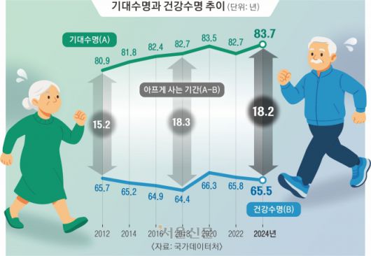 반세기 만에 한국인의 기대수명이 20년 넘게 늘었지만, 정작 ‘건강하게’ 사는 기간은 줄어들고 있다. 지난해 태어난 아기의 기대수명은 83.7세로 역대 최고치를 기록했으나, 질병이나 장애 없이 일상생활이 가능한 ‘건강수명’은 수년째 65세를 넘지 못한다. 오래 살수록 아픈 기간도 함께 길어지는 ‘유병장수’의 그늘이 짙어지고 있다.