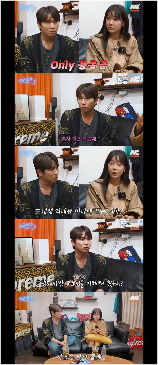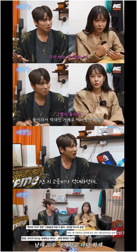 케이윌은 "억대 교육비라는데"라고 물었다. 현영은 “남편 몰래 시작했다. 알면 뭐라할 거다. 통장을 따로 쓴다. 버는 게 다르다”라면서 “교육비는 같이 부담한다. 공동 통장, 개별 통장이 다르다. 공동은 등록금을 쓰고, 학원 같은 건 개별로 쓴다. 알아서 제가 할 수 있는 한 내가 한다”라고 말했다. 학원도 거의 가지 않는 첫째와 다르게 둘째는 학원을 다니고 있기에 이 부분은 현영이 분담하는 것으로 보였다.