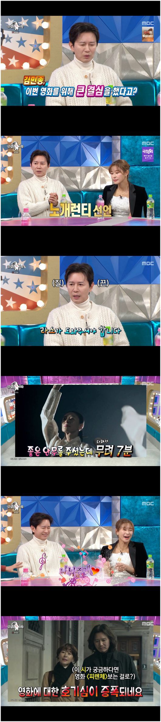 이번 영화에서 장발로 변신한 그의 모습은 사뭇 달라 또한 화제가 됐다. 김구라는 “영화를 위해 큰 결심을 했다는데”라며 더 큰 결심에 대해 물었다. 김민종은 “영화 규모가 크지 않아서 제 개런티가 도움이 될까 해서 노 개런티를 선언했다. 감독님이 ‘만에 하나 영화가 잘 되면 러닝 개런티로 해주겠다’라고 했다. 손익 분기점은 20만 명이다”라면서 “‘라스’가 도와주셔야 합니다”라며 비장하게 말했다.