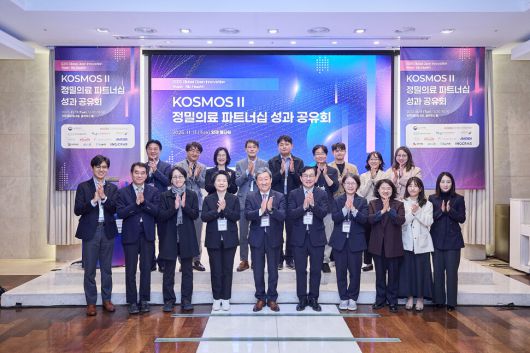 지난 11월11일 한국보건산업진흥원이 개최한 ‘KOSMOS-II 정밀의료 파트너십 성과 공유회\'에서 코스모스 연구의 주요 참여 관계자들이 기념사진을 찍고 있다. 한국보건산업진흥원 제공 |
