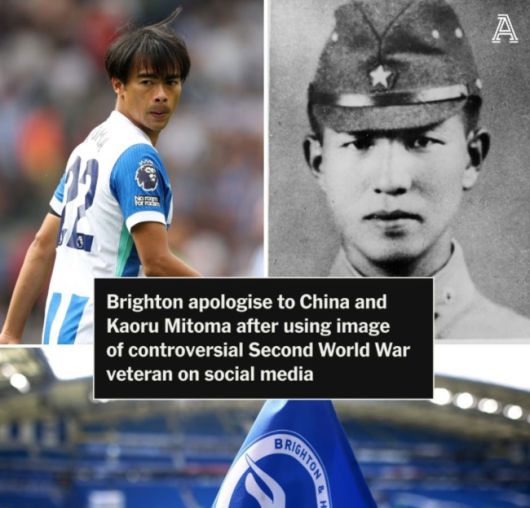 영국 '디 애슬래틱'은 3일(이하 한국시간) "브라이튼은 프리미어리그에선 모든 행동이 국제적으로 주목을 받는다는 걸 또 알았다. 홍보 과정에서 제2차 세계대전 인물을 활용했는데 이로 인해 중국과 소속 선수 일본인 미토마 카오루에게 사과를 했다"고 전했다.