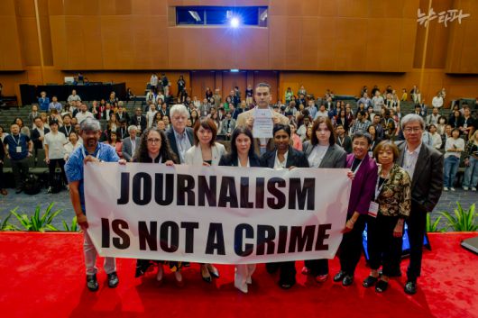 GIJC2025 행사장에서 참가자들이 ‘저널리즘은 범죄가 아니다’라는 구호를 외치고 있다. ⓒGIJC