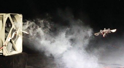 매사추세츠공대(MIT) 연구진이 개발한 로봇 곤충이 선풍기 바람 앞에서도 정상적인 비행 자세를 유지하고 있다. MIT 제공 |