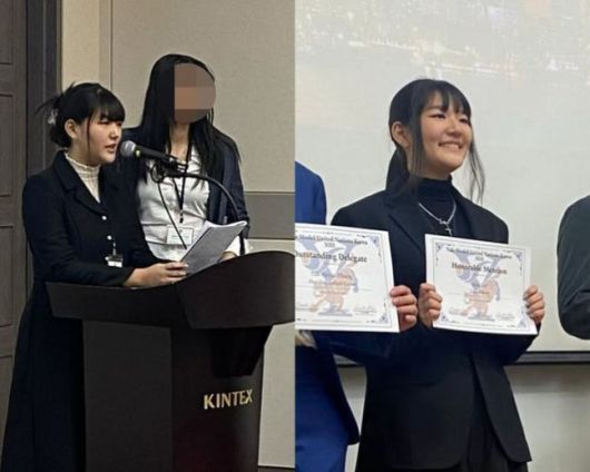 함께 공개된 사진 속 소을이는 상장을 들고 당차게 웃고 있는 모습. 또 다른 사진에서 소을이는 영어로 연설을 펼치고 있어 놀라움을 안긴다.