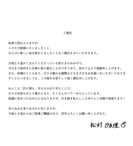 노기자카46 출신 마츠무라 사유리(33)가 2년 열애 끝에 결혼과 임신 소식을 한 번에 전하며 겹경사를 알렸다.사진=마츠무라 사유리 sns |