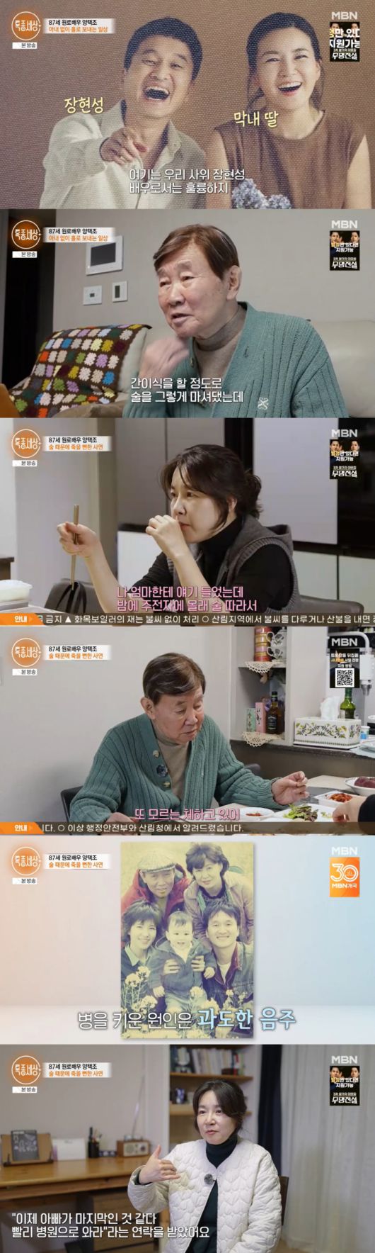 양택조는 간경화로 건강 악화가 된 때를 떠올리며 "술을 많이 마셔서 간경화가 됐다. 간이 돌멩이가 돼서 3개월 시한부가 됐다"라고 떠올렸고 딸은 "아버지 소식을 듣고 숨이 막히는 것 같았다. '아빠가 마지막인 것 같다, 병원으로 오라'는 연락을 받았다. 가는 내내 눈물이 줄줄 흘렀다. 아빠는 삶을 포기해서 술도 더 많이 드셨다고 한다"라고 울컥했다. 다행히 양택조는 이후 아들에게 간 이식을 받아 건강을 되찾았다고.