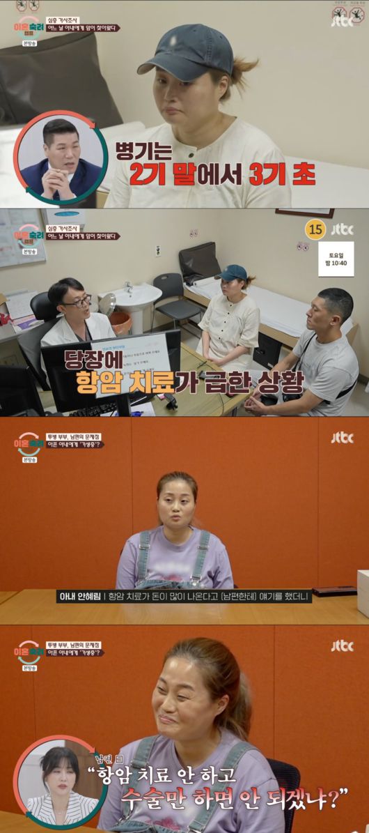 아내는 인터뷰를 통해 암 진단 후 남편과 겪었던 가슴 아픈 일화를 공개했다. 아내는 "수술비는 덜 나오지만 항암 치료가 돈이 많이 나온다고 했더니, (남편이) 항암 치료 안 하고 수술만 하면 안되겠냐고 했다"는 충격적인 이야기를 전했다. 아내는 남편이 "돈 때문에 그렇게 말한 것 같다"고 덧붙이며 눈물을 감추지 못했다. 남편 역시 경제적 부담 때문에 그런 요청을 한 것이 맞다고 인정했다.