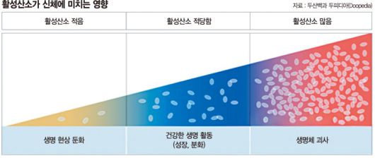 쉽게 말하면 자동차가 연료를 태우며 달리는 과정에서 부산물인 배기가스가 나오게 되는 것과 같이, 활성산소는 우리가 살아가는데 어쩔 수 없이 발생하는 생활의 찌꺼기와 같은 것이다.