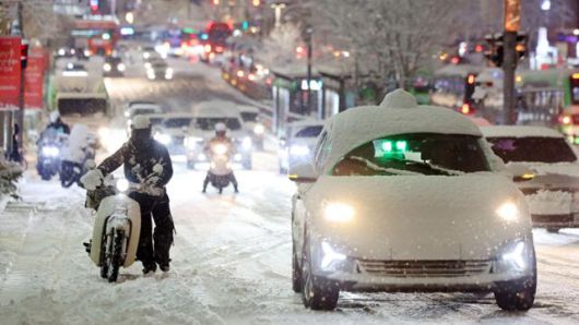 서울 지역에 첫눈이 크게 내린 4일 퇴근길 무렵, 마포구 홍대 인근에 제설작업이 완료되지 못해 미끄러운 빙판길을 눈 덮인 택시와 오토바이 운전자가 서행하고 있다. 이날 늦은 오후부터 강한 눈 구름대가 중부지방을 빠르게 휩쓸고 지나가면서 서울, 인천, 경기, 강원에 한때 대설주의보가 발령됐다가 밤 무렵이 돼서야 해제됐다. 갑작스럽게 내린 많은 눈으로 5일 아침엔 곳곳에서 도로 살얼음이 나타나 '출근길 대란'이 예상된다. 연합뉴스