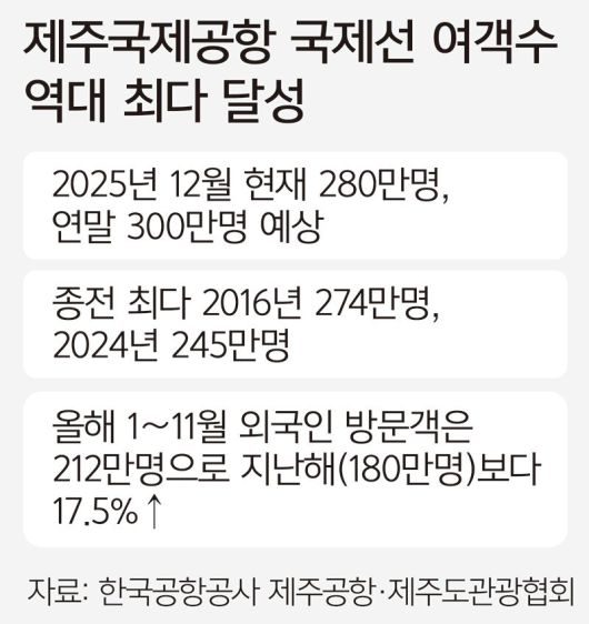 4일 한국공항공사 제주공항 등에 따르면 올해 제주공항 국제선 여객 수는 2일 기준 280만명으로 집계됐다. 이는 역대 최고치로 직전 기록은 2016년 274만명이었다. 제주공항은 연말까지 지난해(245만명)보다 23% 증가한 300만명 돌파를 전망했다. 이달 3일까지 올 한 해 제주를 찾은 외국인은 212만여명으로, 지난해(180만여명)보다 17.5% 증가했다.