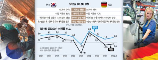 지난해 경제가 역(逆)성장하면서 ‘유럽의 병자’라는 오명을 쓴 독일에서 “한국 경제가 독일과 닮아가고 있어 구조 개혁이 필요하다”는 경고의 목소리가 나왔다. 국가 경제에서 제조업이 차지하는 비중이 큰 데 비해 공장을 돌리는 데 필요한 에너지를 대부분 수입에 의존하고 있고 중국에 대한 수출 경쟁 민감도가 높아 대외 충격에 쉽게 흔들린다는 점에서다.