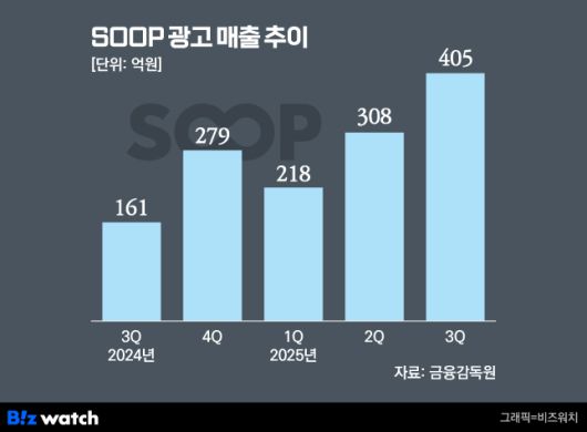 여기에 대형 e스포츠 대회를 잇달아 개최해 콘텐츠형 광고 매출이 대폭 상승했다. SOOP의 분기별 광고 매출은 올해 1분기 218억원에서 2분기 308억원, 3분기 405억원으로 매분기100억원씩 증가하며 상승세를 이어가고 있다.