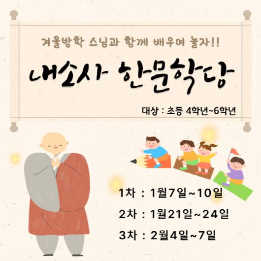 진각스님은 “겨울방학 동안 아이들이 스마트폰과 일상에서 잠시 벗어나 자연 속에서 스스로를 돌아보고 배움을 즐길 수 있는 시간을 마련하고자 했다”며 “한문 학습과 예절 교육을 통해 타인을 배려하는 마음과 규칙·질서를 익히는 소중한 계기가 되길 바란다”고 말했다.