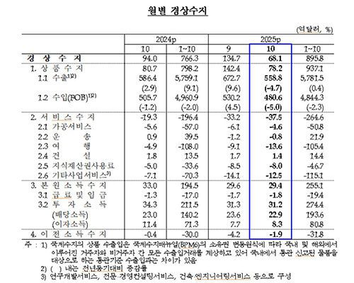 한국은행이 오늘(5일) 발표한 국제수지 잠정 통계에 따르면 10월 경상수지는 68억 1천만 달러(약 10조 447억 원) 흑자로 집계됐습니다.