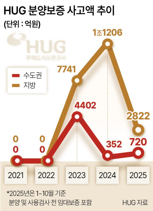 2021년, 2022년에는 없었던 분양보증 사고는 2023년 16곳(1조2143억원), 2024년 17곳(1조1558억원) 등으로 늘었다가 올해 들어 감소했다. 수도권 분양보증 사고액은 지난해 352억원에서 올해 720억원으로 증가했지만 지방 사고액이 같은 기간 1조1206억원에서 2822억원으로 급감한 결과다. 사고건수도 지방은 15건에서 6건으로 절반 이상 줄었다.