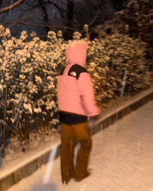 첫눈이 쌓인 눈밭을 즐기는 김나영의 모습은 남편 마이큐가 담는 것으로 보이며, 애정이 느껴진다.