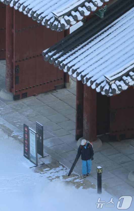 (서울=뉴스1) 임세영 기자 = 5일 서울 종로구 경복궁에서 관계자가 밤새 내린 눈을 치우고 있다. 2025.12.5/뉴스1seiyu@news1.krCopyright ⓒ 뉴스1. All rights reserved. 무단 전재 및 재배포, AI학습 이용 금지.