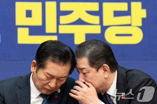 (서울=뉴스1) 이승배 기자 = 정청래 더불어민주당 대표와 김병기 원내대표가 5일 서울 여의도 국회에서 열린 최고위원회의에서 대화하고 있다. 2025.12.5/뉴스1