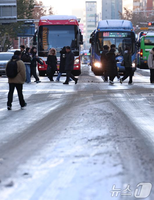 (서울=뉴스1) 구윤성 기자 = 폭설 후 한파로 도로 곳곳이 얼어붙은 5일 오전 서울 종로일대 도로에 눈이 쌓여 있다. 2025.12.5/뉴스1kysplanet@news1.krCopyright ⓒ 뉴스1. All rights reserved. 무단 전재 및 재배포, AI학습 이용 금지.