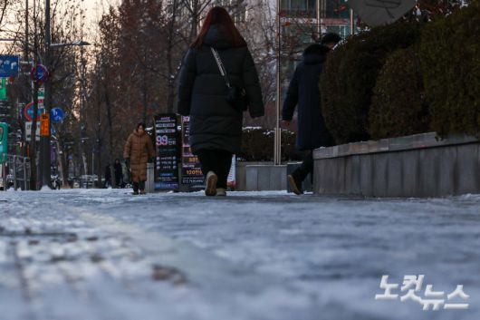 폭설 후 한파로 도로 곳곳이 얼어붙은 5일 오전 서울 송파대로에서 시민들이 빙판길을 걷고 있다.