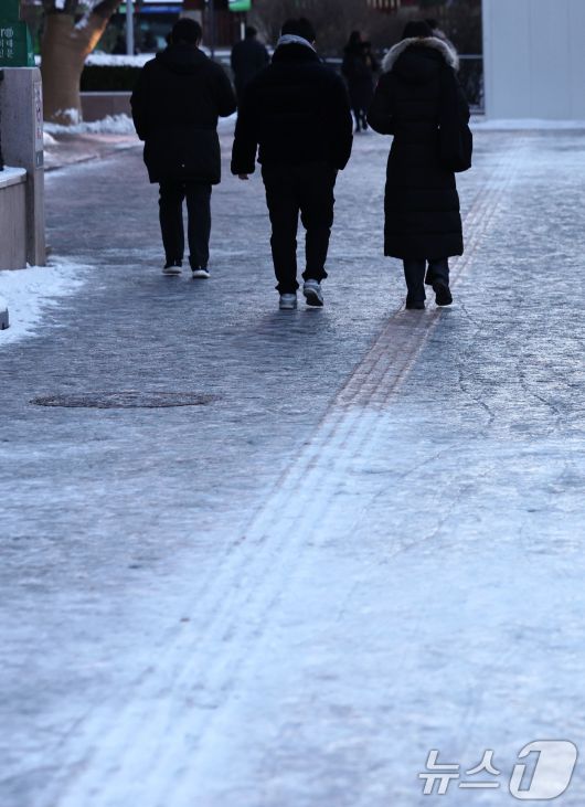 (서울=뉴스1) 구윤성 기자 = 폭설 후 한파로 도로 곳곳이 얼어붙은 5일 오전 서울 광화문역 일대에서 시민들이 출근길 발걸음을 옮기고 있다. 2025.12.5/뉴스1