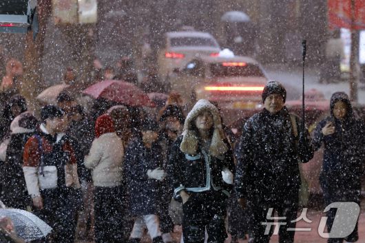 첫눈이 내린 4일 오후 서울 중구 명동을 찾은 관광객들이 내리는 눈을 맞으며 즐거워하고 있다. 기상청은 "퇴근 시간대 강한 눈이 내릴 가능성이 크다"며 동네 예보와 실시간 날씨를 확인할 것을 당부했다. 2025.12.4/뉴스1 ⓒ News1 박정호 기자"> |