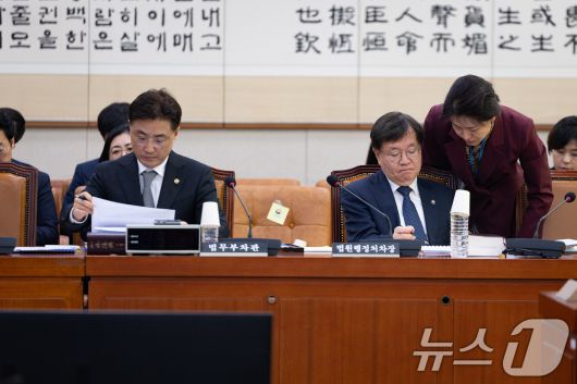 (서울=뉴스1) 유승관 기자 = 이진수 법무부 차관(왼쪽)과 배형원 법원행정처 차장이 5일 서울 여의도 국회에서 열린 제429회 국회(정기회) 법제사법위원회 제9차 법안심사제1소위원회에 출석해 회의를 준비하고 있다. 2025.12.5/뉴스1fotogyoo@news1.krCopyright ⓒ 뉴스1. All rights reserved. 무단 전재 및 재배포, AI학습 이용 금지.