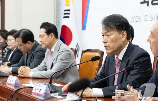 (서울=뉴스1) 이승배 기자 = 윤한홍 국민의힘 의원이 5일 서울 여의도 국회에서 열린 '혼용무도' 이재명정권 6개월 국정평가 회의에서 발언하고 있다. 2025.12.5/뉴스1