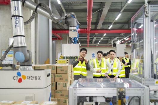 CJ대한통운 인천 GDC를 방문한 태국 최대 유통사 CP 엑스트라 경영진들이 박스를 자동 분류해 파렛트에 쌓는 '이동형 로봇 팔레타이저'에 대해 설명을 듣고 있다. |