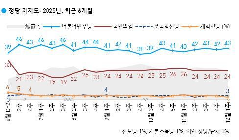 정당 지지도는 더불어민주당 43%, 국민의힘 24%, 조국혁신당 3%, 개혁신당 2%, 진보당, 기본소득당 각각 1%로 나타났다. 무당(無黨)층은 24%로 조사됐다. 한국갤럽은 “8월 중순 이후 여당 지지도 40% 내외, 국민의힘 20%대 중반 구도가 이어지고 있다”고 했다.