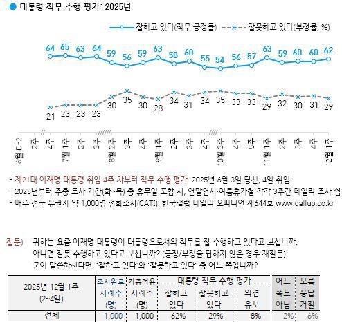 취임 6개월을 맞은 이재명 대통령의 12월 첫째 주 지지율이 전주보다 2%포인트 상승한 62%를 기록했다는 여론조사 결과가 5일 나왔다.
