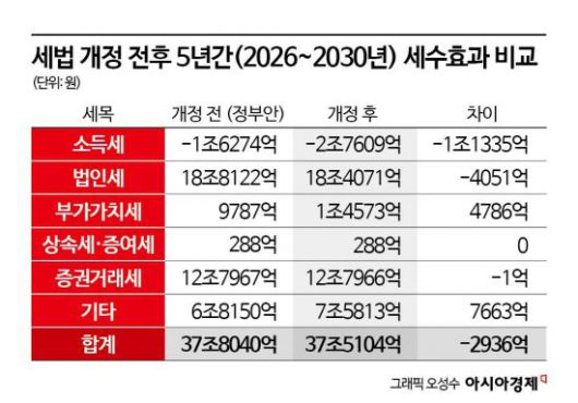 5일 국회예산정책처가 공개한 '2025년 개정세법 심의 결과 및 주요 내용' 분석 보고서에 따르면 국회의 세법 개정을 거치면서 당초 세수 예측치가 37조8040억원에서 2936억원 줄어 37조5104억원에 이를 것으로 예상된다.