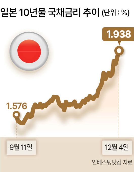 이날 일본 채권시장에서 장기금리 지표인 10년 만기 국채 금리는 연 1.938%를 기록했다. 2008년 글로벌 금융위기 직전인 2007년 7월 이후 18년 만에 최고치다. 지난 9월 국채금리가 1.576%였던 점을 감안하면 약 두 달 반 만에 0.371%포인트 올랐다.