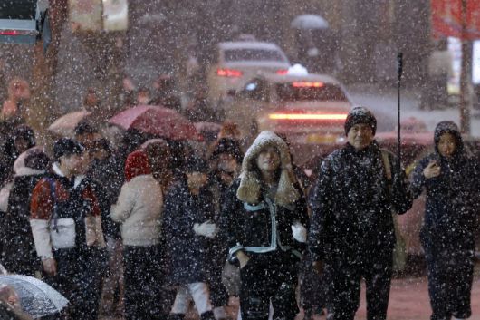 첫눈이 내린 4일 오후 서울 중구 명동을 찾은 관광객들이 내리는 눈을 맞으며 즐거워하고 있다. 기상청은 "퇴근 시간대 강한 눈이 내릴 가능성이 크다"며 동네 예보와 실시간 날씨를 확인할 것을 당부했다. 뉴스1 |