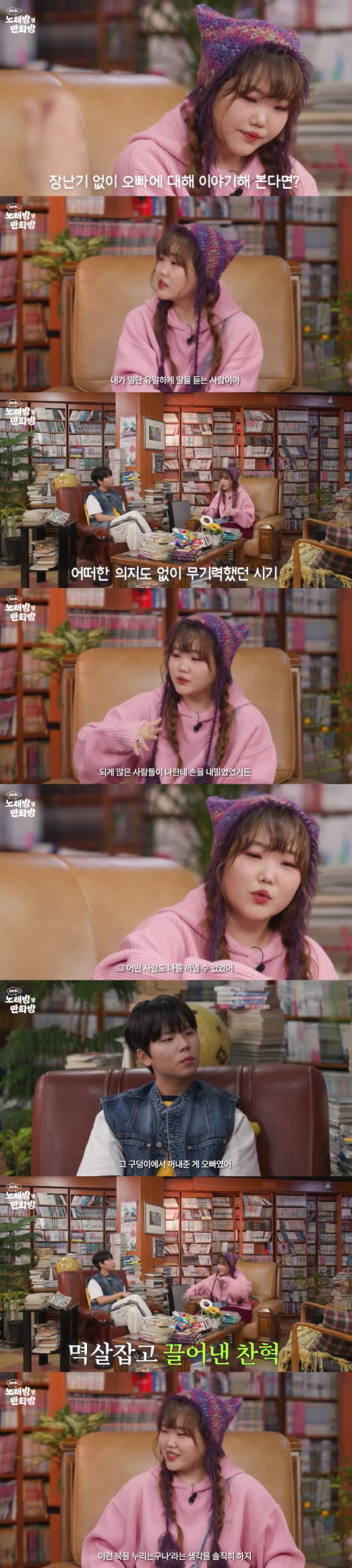 이어 "내가 정말 아무런 의지가 없을 때가 있었는데, 되게 많은 사람들이 손을 내밀었지만 그 어떤 사람도 꺼낼 수가 없었다"면서 "근데 그 구덩이에서 꺼내준 사람이 오빠였다. '정신 차려! 이리와' 해서 정신차려보니까 올라와 있었다"라고 떠올렸다.
