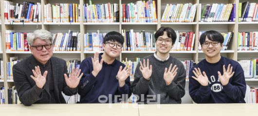 왼쪽부터 최재일 광남고등학교 교장, 왕정건 학생, 고무성 담임선생님, 서장협 전년도 수능 만점자.