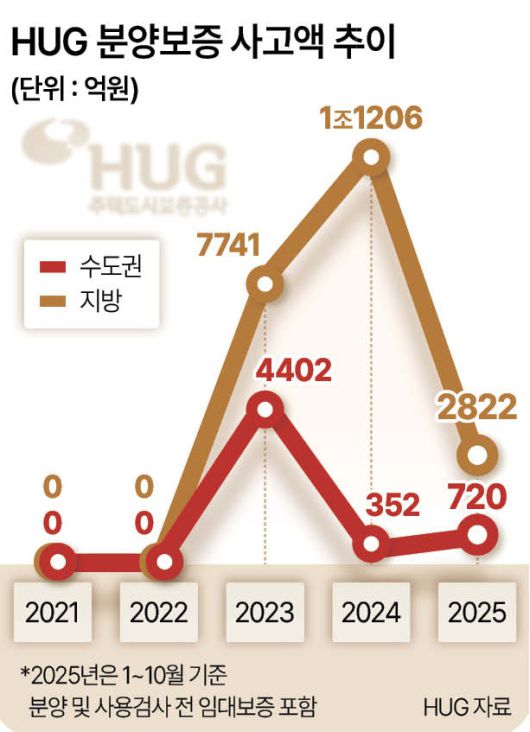 5일 HUG의 ‘분양보증(사용검사 전 임대보증 포함) 사고 현황’ 자료에 따르면 올해 1~10월 전국 7곳의 사업장에서 3543억원 규모의 보증사고가 발생했다. 수도권에선 경기 1곳(720억원)이었고, 지방은 ▷강원 2곳(862억원) ▷광주 1곳(450억원) ▷울산 1곳(639억원) ▷전북 2곳(871억원) 등 6곳에서 분양보증 사고가 났다.