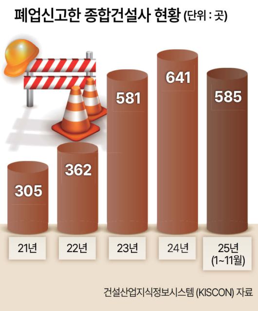 이달 들어서도 문을 닫는 건설사가 계속 생기면서, 올 한 해 폐업 종합건설사 수는 사상 최대치를 경신할 것으로 전망된다. 이날 기준 폐업 종합건설사는 4일 만에 15곳이 더 늘면서 총 600곳으로 집계됐다. 이 속도라면 지난해 1년간 폐업한 종합건설사 수(641곳)도 넘어설 예정이다.