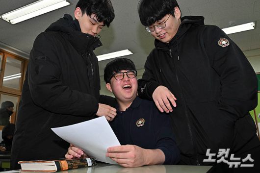 2026학년도 대학수학능력시험(수능) 성적표가 배부된 5일 서울 광진구 광남고등학교에서 수험생들이 성적표를 확인하고 있다.