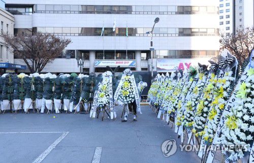 (대구=연합뉴스) 박세진 기자 = 5일 대구FC 응원단 '그라지예'가 프로축구 K리그2로 강등된 구단의 쇄신을 촉구하며 대구 중구 대구시청 동인청사 앞에 근조화환을 설치했다. 2025.12.5