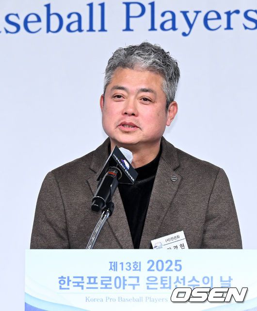 [OSEN=이대선 기자] 5일 오전 서울 강남구 호텔 리베라에서 제13회 2025 한국프로야구 은퇴선수의 날 시상식이 열렸다. 이 시상식은 각지로 흩어져 활동 중인 프로야구 은퇴선수들이 한자리에 모여 한 해 동안 한국 야구의 발전을 위해 달려온 이들에게 감사의 마음을 표하고자 개최하는 행사다. 안경현 회장이 인사말을 하고 있다. 2025.12.05 /sunday@osen.co.kr