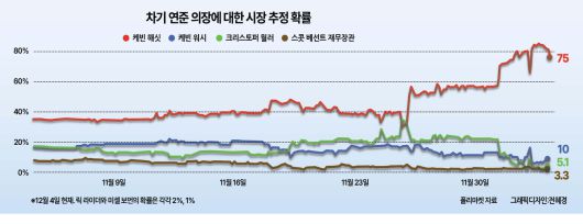 미국 연방준비제도(Fed·연준)가 12월 회의에서 기준금리를 인하할 것이라는 기대가 커지고 있다. 이 경우 금리인하 반대 의견이 나올 가능성도 제기된다. 차기 연준 의장 발표는 내년 1월로 연기될 전망이다. 블록체인 기반 예측시장 플랫폼 폴리마켓에 따르면 유력 후보 중에선 케빈 해싯 백악관 국가경제위원회(NEC) 위원장이 가장 높은 가능성을 보이고 있다.