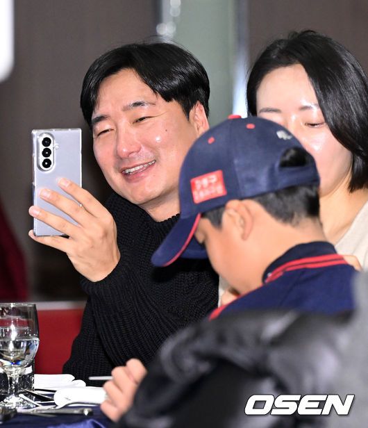 두산 정재훈 코치가 수상을 한 아들 정이도 군을 찍고 있다. 2025.12.05 /sunday@osen.co.kr